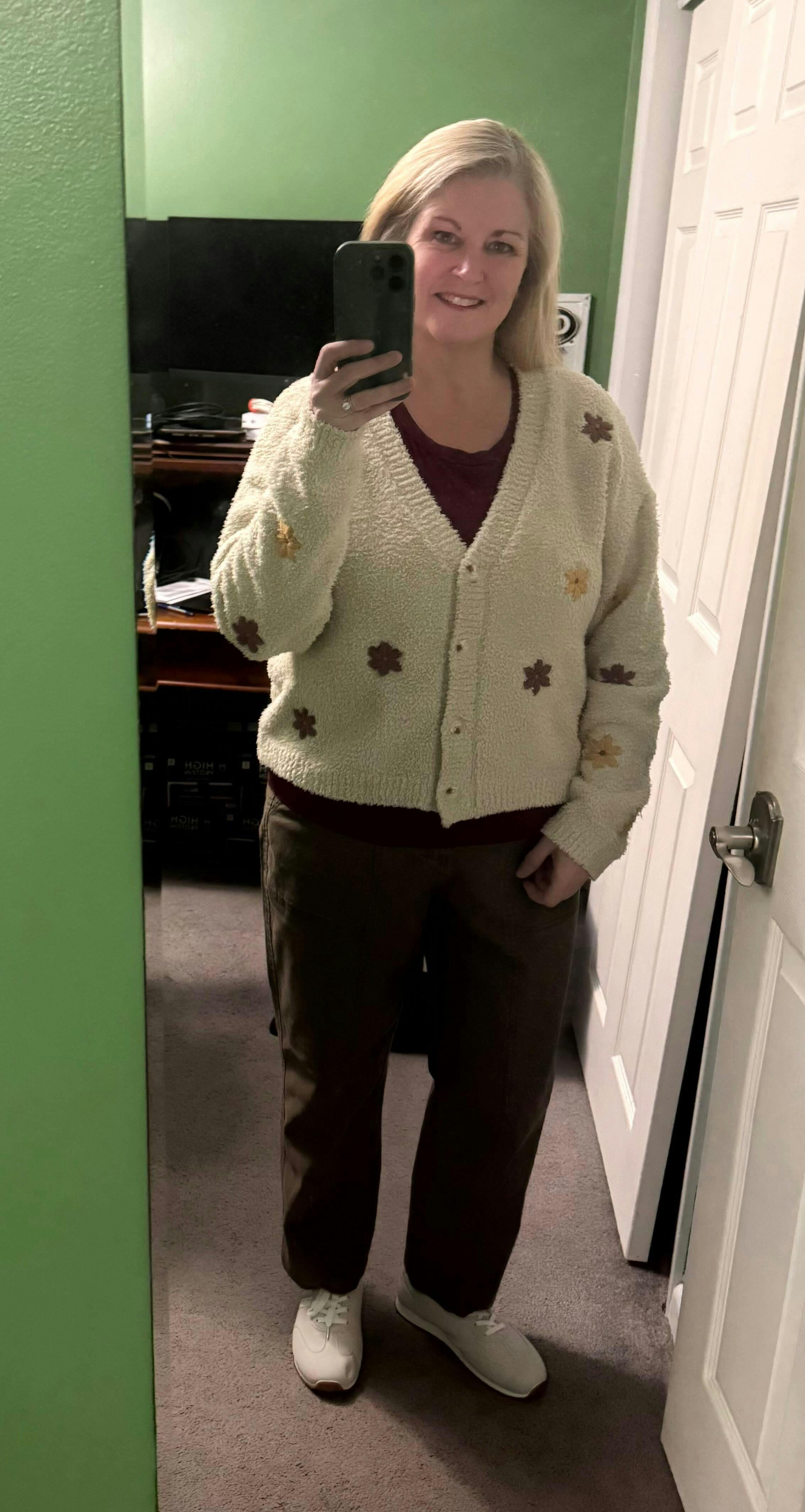 This cozy cream cardigan is the perfect blend of comfort and charm. It features a soft, textured knit with a deep V-neckline and button-front closure finished with subtle gold-tone buttons. Playful embroidered floral appliqués in warm fall hues — mustard yellow, rust, and maroon — add a vintage-inspired, handcrafted touch that makes it stand out from the basics.